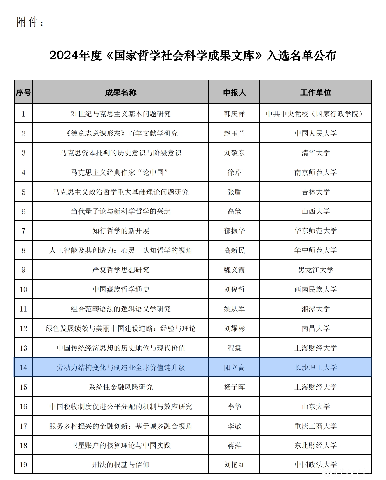 近日,全国哲学社会科学工作办公室公布了2024年度《国家哲学社会科学成果文库》入选名单,浦京阳立高教授的成果《劳动力结构变化与制造业全球价值链升级》入选。