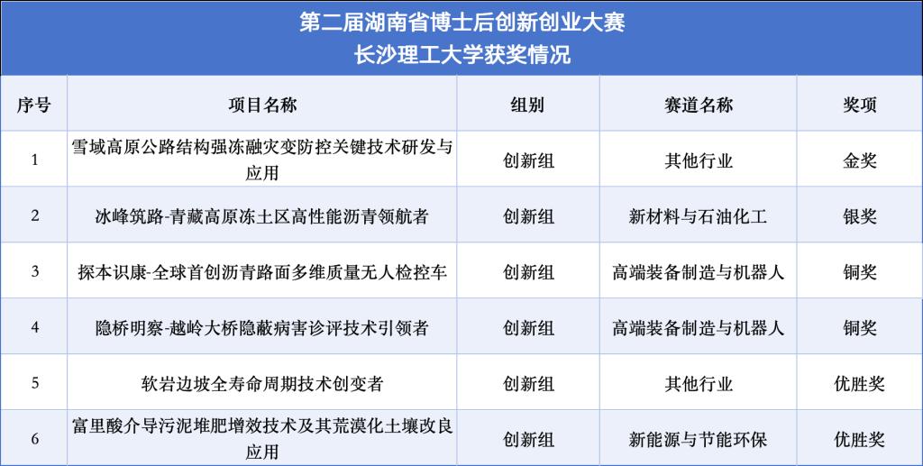本次大赛由湖南省人力资源和社会保障厅主办,以“博领创新·才展三湘”为主题,设置创新组和创业组两个组别,紧扣湖南省“4×4”现代化产业体系规划确立的重点领域。经初赛后,122个项目进入决赛,涉及信息技术与人工智能、高端装备制造与机器人、新能源与节能环保、新材料与石油化工、生物医药与大健康、现代农业与食品等领域。决赛共产生金银铜奖48个,其中浦京博士后高峰团队《雪域高原公路结构强冻融灾变防控关键技术研发与应用》等8个获得金奖的项目将代表湖南参加第三届全国博士后创新创业大赛。