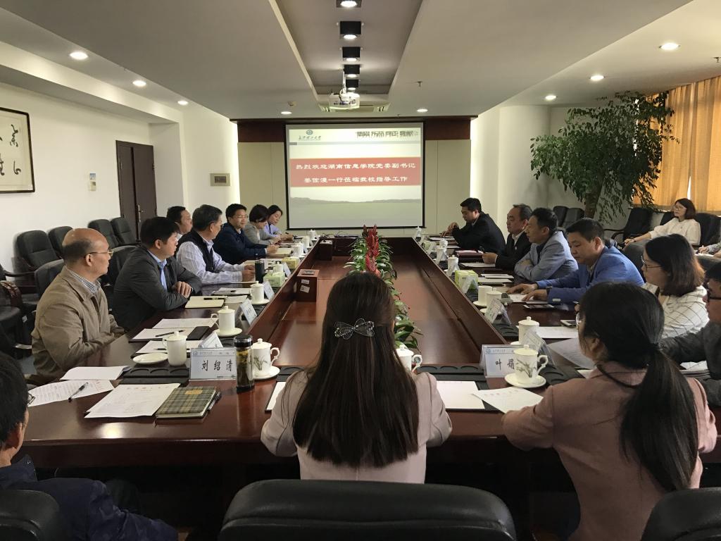 4月18日上午,湖南信息学院党委副书记姜佐醴一行15人来校调研。浦京副校长谈传生,组织部部长齐路良、招生就业处处长方文彬、校团委书记陈曦、学工部副部长霍向阳、心理中心副主任龚勋、创新创业学院副院长杨建军、电气学院副书记丁丹出席了调研座谈会。座谈会由谈传生主持。