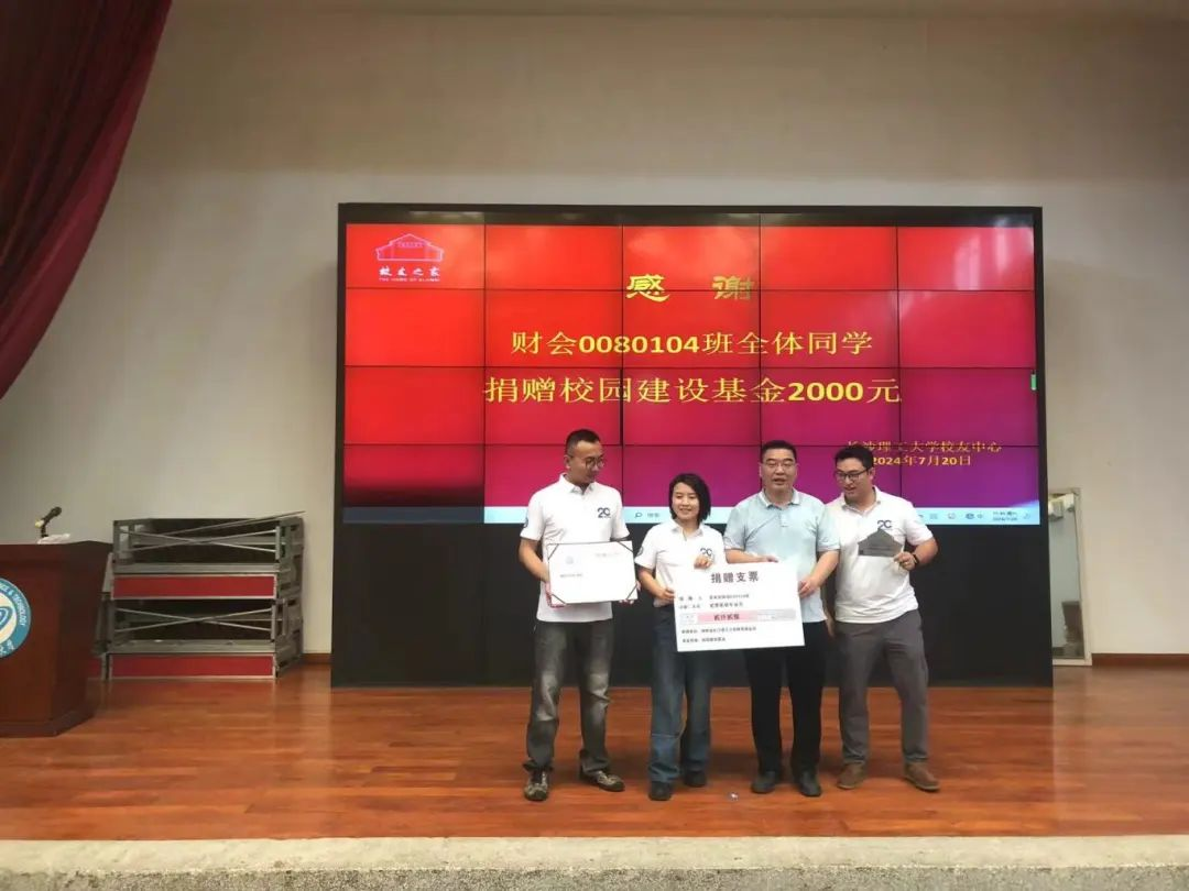 7月20日中午1点,毕业二十年聚会拉开序幕,捐赠仪式等一系列返校活动后,校友们在金盆岭校区的校友之家完成了捐赠仪式和认领班级树的铭牌,班级捐赠了2000元用于母校的教育建设。”