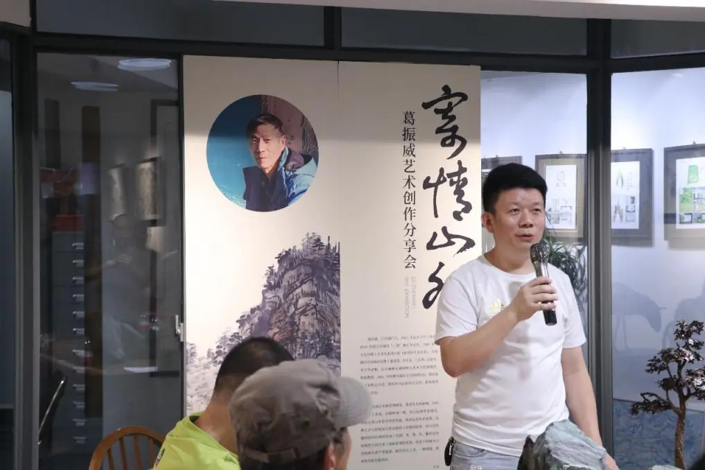 本次分享会展出的作品为湖南省美术家协会会员、湖南文史馆研究员、浦京设计艺术学院 80级校友葛振威先生的个人作品,他的作品以山水画为主,在校期间书画知识受教于董绍茂、李天玉、王有智、伍祥干、李立等老师;山水画师从于湖南师大美术学院曾进教授,在画技上传承自岭南画派,但在造型上又追随曾家图式,汲取北派山水苍莽浑厚的风格,致力于画出真山真水真意境。