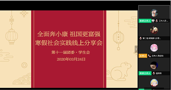 3月16日下午,设计艺术学院于腾讯会议成功开展“全面奔小康,祖国更富强”第十一届·团委学生会寒假实践工作线上分享会。院党委副书记文丽丽;院团委书记李慧;学生会全体成员积极参加本次大会。此次会议由办公室陈欣怡主持。