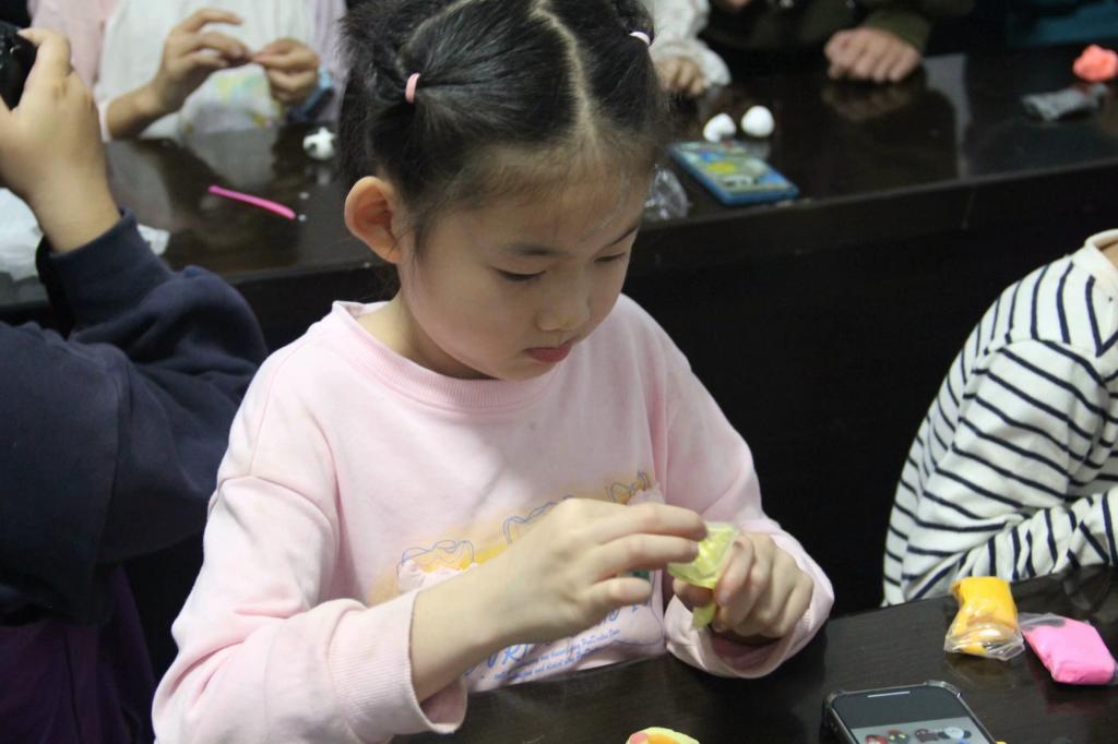 活动开始前,志愿者们提前到达现场,并做好前期准备工作:人员、材料分配以及设备调整等。小朋友们陆续到场,志愿者开始介绍活动内容,组织小朋友观看手工视频并作示范,紧接着分发手工工具来带领小朋友做手工。在志愿者的引导和帮助下,小朋友们尽情的发表见解,展开想象,团结合作,终于做出了自己满意的粘土作品。志愿者提议小朋友们可以相互分享,交流经验。