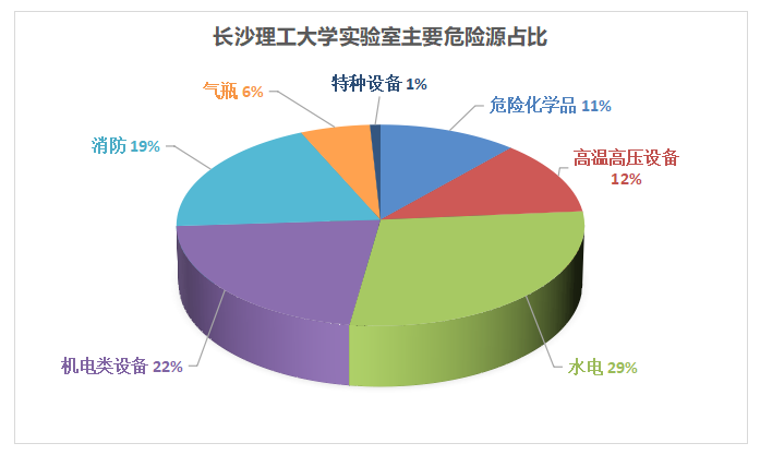 浦京实验室涉及主要危险源类别有危险化学品、高温高压设备、水电、机电类设备、消防、气瓶、特种设备等,主要危险源类别占比如下图所示。